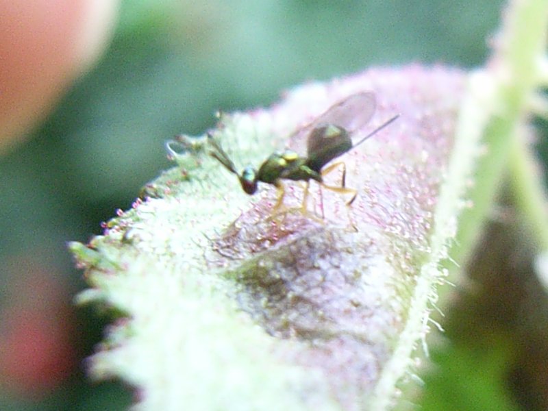 30/08/2007, tuin Moeraske, zeer klein wespje bij toeval opgemerkt tijdens het observeren van een gal van de Rozebladgalmug (Wachtliella rosarum) - Cecidomyiidae op Rosa canina (Rosier des chiens, Eglantier commun - Hondsroos) - Rosaceae, BH.