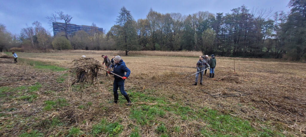 Le sol étant détrempé, il n’était pas question d’utiliser les débroussailleuses aussi le groupe s’est attelé à dégager les nombreux andains restés sur la prairie humide, elle est complètement déblayée aujourd’hui.