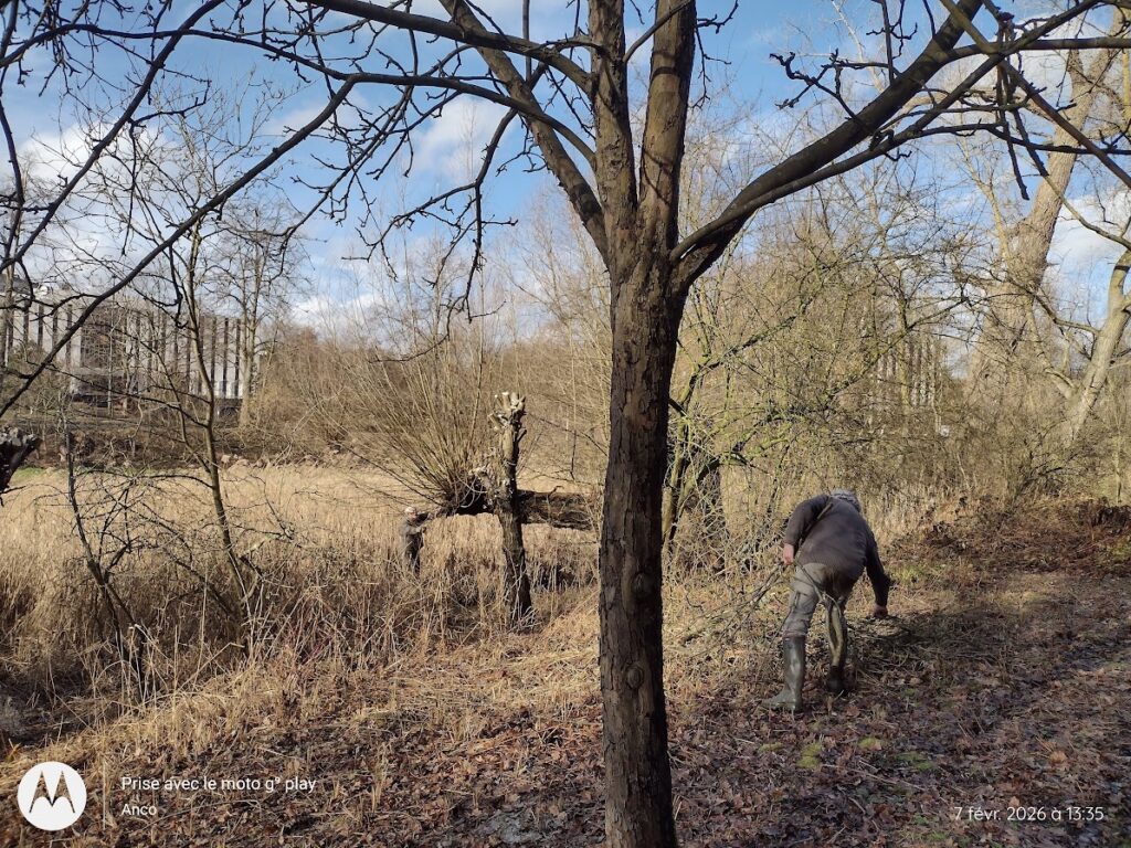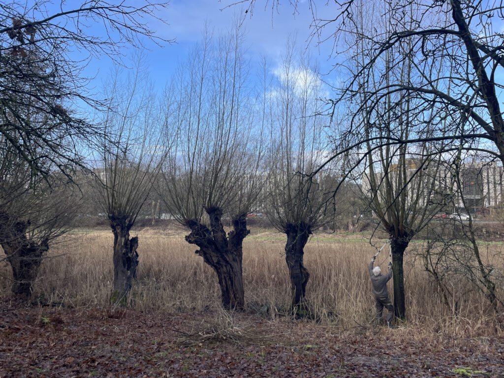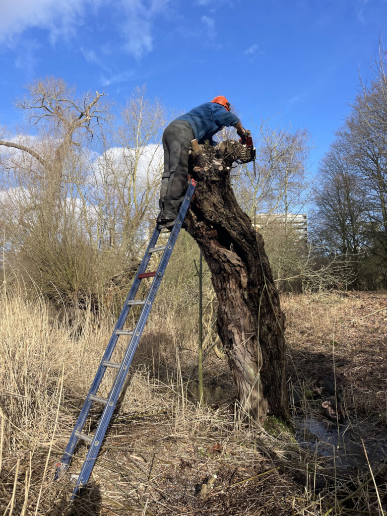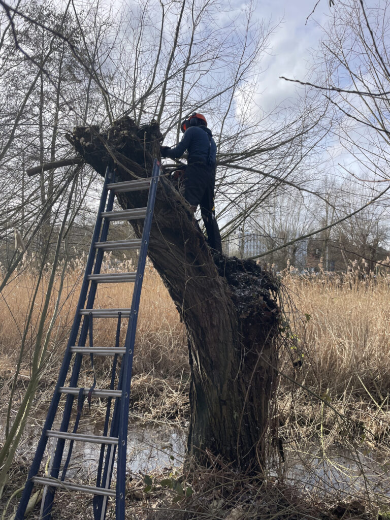Le travail principal consistait à étêter un ensemble de saules têtards. Pour rappel, ceux-ci sont taillés tous les cinq ans, selon un roulement établi de longue date. Cette opération consiste à couper les longues branches devenues trop lourdes, qui fragilisent l’arbre, afin de lui redonner sa silhouette si caractéristique. Un saule têtard n’est donc pas une espèce particulière de saule, mais bien un mode de conduite, une technique de taille qui peut s’appliquer à de nombreuses espèces de saules. Et comme l’énergie ne nous manquait pas, nous en avons aussi profité (et c’était nécessaire !) pour réparer une clôture contre laquelle les équidés de la prairie aiment tant s’appuyer, ainsi que pour limiter l’extension des typhas sur un tronçon d’une vingtaine de mètres dans la Woluwe, ainsi que la remise à niveau de l’eau de nos deux barrages en prévision de la ponte des batraciens sur le site. On n’a pas chômé ! »
