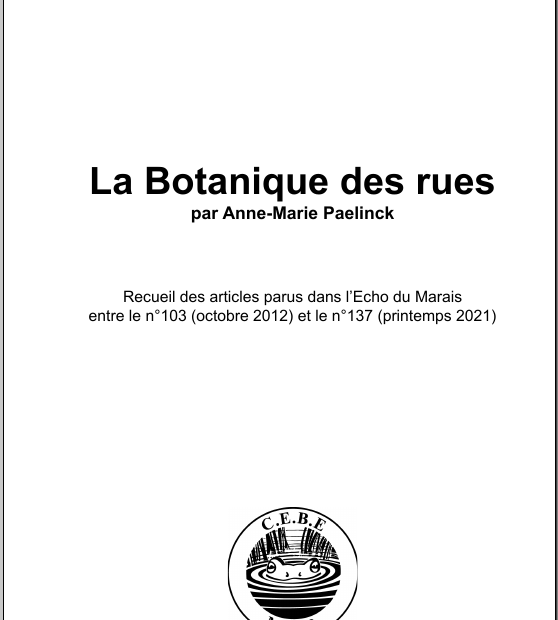 Par Anne-Marie Paelinck L’ensemble des pages “La Botanique des Rues”, publiées dans l’Echo du Marais entre ocotobre 2012 et mars 2021. Gratuit, à télécharger.