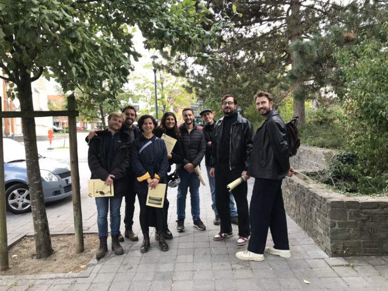 En ce beau dimanche ensoleillé, Jean nous avait invité à une balade (oui, on a parcouru plusieurs kilomètres) de l’Hof ter Musschen jusqu’au quartier de Kapelleveld et sa cité-jardins. Un petit passage par la prairie humide (afin de décourager les personnes munies de petites chaussures…) de manière à indiquer la topographie des lieux cartes à l’appui.Nous avons contourné la ferme, puis longé la prairie sèche et via l’avenue Chapelle aux Champs, nous sommes arrivés à l’église Notre-Dame de l’Assomption. Les cloches (et le trafic sur l’avenue Vandervelde) interrompaient régulièrement les explications de JeanBien évidemment, Jean n’a pu s’empêcher de montrer …